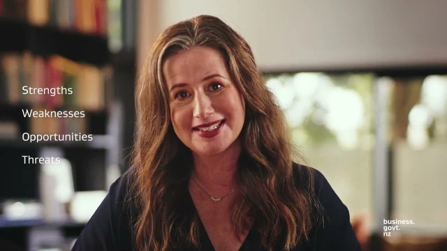 [Visual: White lettering “SWOT Analysis” appears on the screen to the right of the presenter. The letters SWOT then stack on top of each other to the far right of the screen as the screen zooms into a profile shot of the presenter. White lettering saying “Strengths”, “Weaknesses”, “Opportunities” and “Threats” appear beside their respective first letter as the speaker says them. The screen then zooms out again to an upper body shot of the presenter as the text remains on the right. After five seconds the white text fades out and the rest of the screen stays the same.]